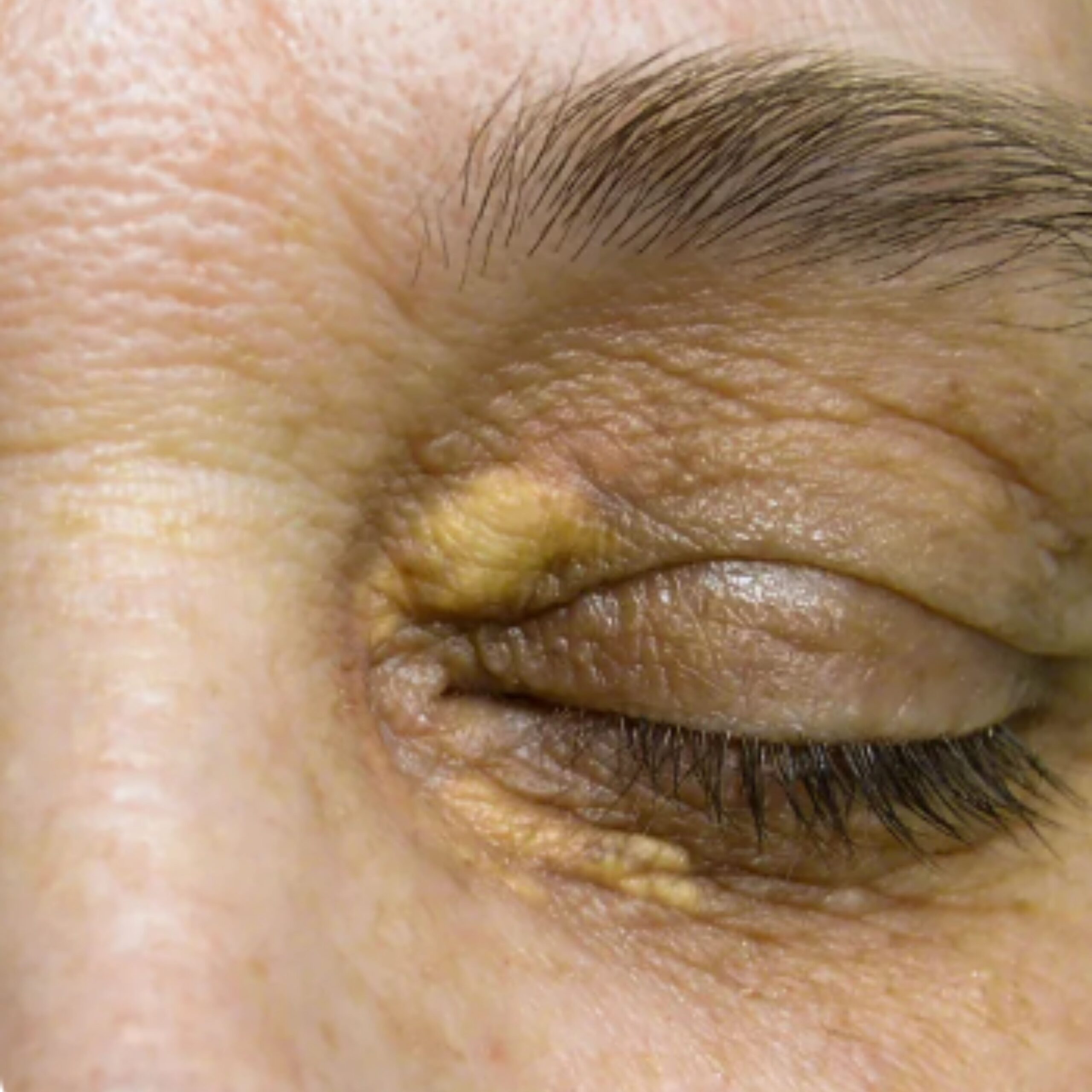 A condition characterised by yellowish deposits of fat under the skin around the eyes
